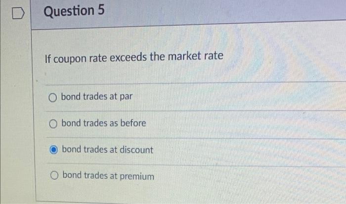 Solved Question 5 If coupon rate exceeds the market rate O ...
